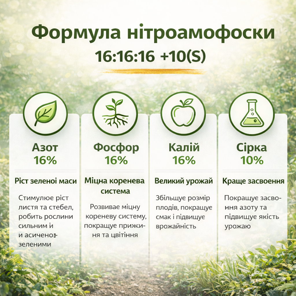 - ✅ Збалансована формула: 16% азоту, 16% фосфору, 16% калію та 10% сірки